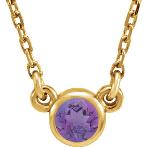Delicate and dainty, this simple yet stylish necklace will make a big impression. It features a 4mm faceted genuine amethyst bezel set in 14k yellow gold. The round pendant is attached to 1mm width, diamond-cut cable chain finished with a spring ring clasp and is 16 inches in length. The color range varies on all gemstones so please allow for slight variations in shades. The color on your screen may also not reflect actual gemstone color due to variations in monitors.