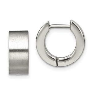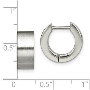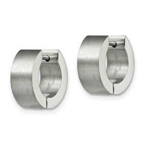 A simple huggie style hoop earring rendered in stainless steel is a classic fashion staple suitable for both men and women. This pair features a hinged design with a notched post, a brushed finish and measures approximately 5.5mm (3/16 inch) in width by 13mm (1/2 inch) in diameter.