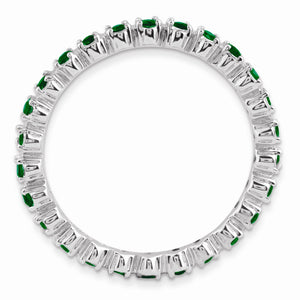 Created Emerald, May's birthstone symbolizes luck, creativity and well-being; bringing wisdom and reason. This 2.5mm polished band fashioned from rhodium plated sterling silver is prong set with round gemstones totaling .6 of a carat. Guaranteed to fit together perfectly with all of the mix and match Stackable Expressions rings.