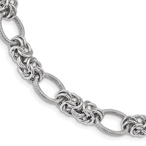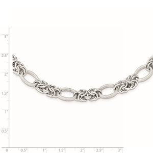 A striking fancy link necklace fashioned from polished and textured rhodium-plated sterling silver featuring a solid multi-link design that come together with a fancy lobster clasp. It is approximately 10mm (3/8 inch) in width by 18 inches in length.