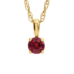Ruby, the gemstone that brings red to vivid life is certain to draw attention and is the gem most often used to celebrate those born in July. This classic 14-inch girls necklace features a faceted 3mm round gemstone in a four-prong basket setting and a 0.75mm width solid loose rope chain finished with a spring-ring clasp made of 14k yellow gold. The genuine ruby is heat-treated and the stone weight is approximately 1/6 carat. The color range varies on all natural stones so please allow for slight variations in shades. This is a made to order item and is estimated to ship 11/24/2025