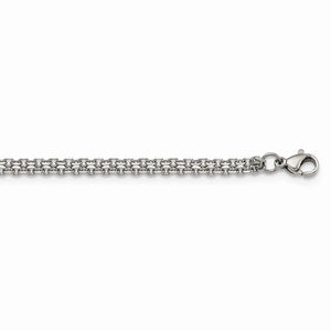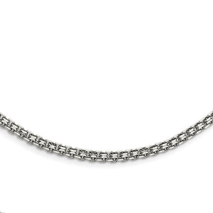 Displaying a contemporary design, this incredible Bismark chain necklace features a tight mesh arrangement that resembles a chain link fence. This polished chain is approximately 3mm in width by 20-inches in length and closes with a fancy lobster clasp.