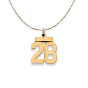 Celebrate your favorite sports player, lucky number or milestone date in your life with a prominent 14k yellow gold charm. Each polished number is approximately 13mm (1/2 Inch) in length, which is finished with a 2mm top bar and a classic jump ring. The pendant is . Includes a 18 inch, 0.8mm 14k yellow gold cable chain with a lobster clasp.