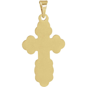 • Celebrate and honor all special occasions with jewelry of religious significance! Our collection of spiritually inspired designs that show faith, hope and devotion are perfect for commemorating life's milestones. This Eastern Orthodox large cross pendant crafted in 14k yellow gold features a polished back that is suitable for engraving. The approximate size is 21mm (13/16 inch) in width by 35mm (1 3/8 inch) in length with the bail. This item does not include a chain.