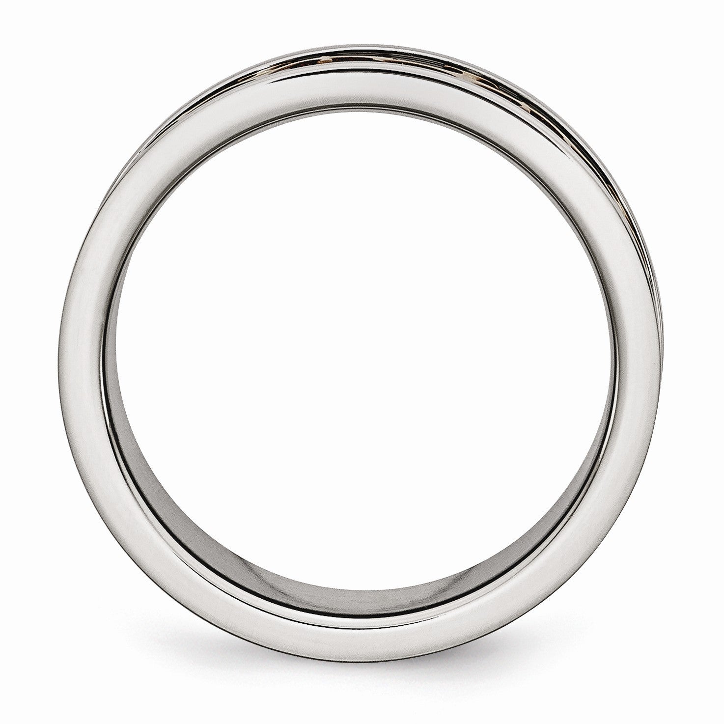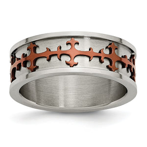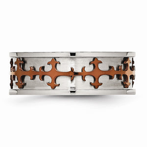Divine inspiration! Set in the recessed center of this 8mm brushed and polished stainless steel band are embossed fleur-de-lis crosses with a cognac-plated finish.