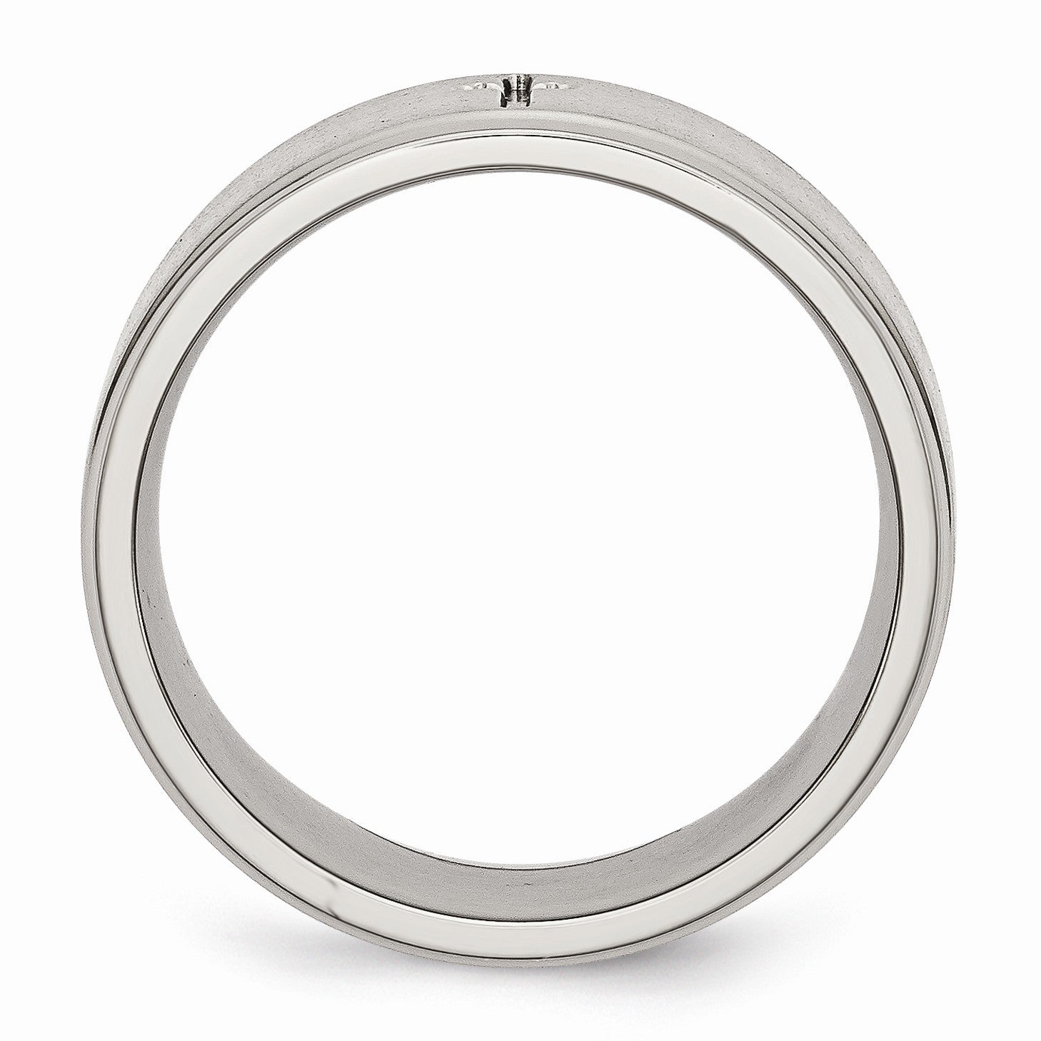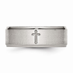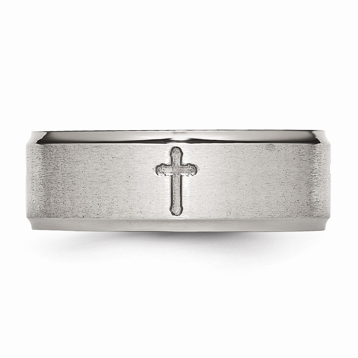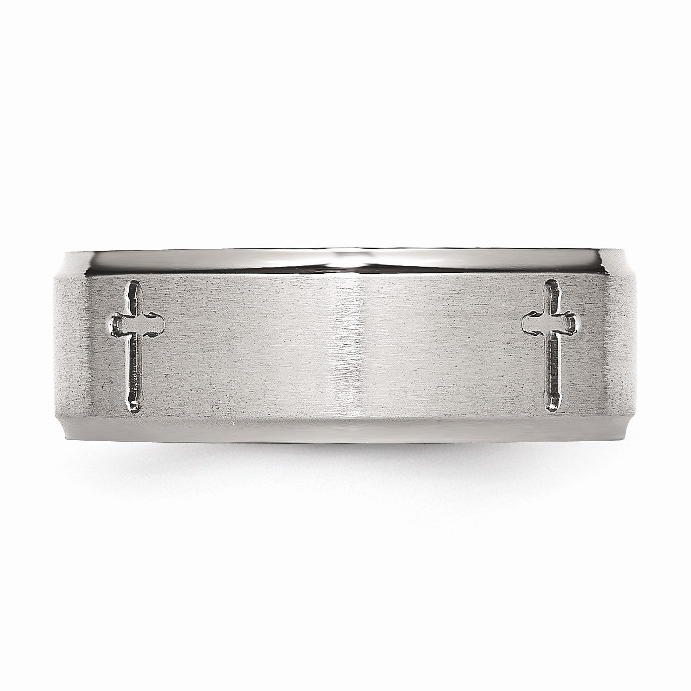 This power driven, cross ring fashioned from stainless steel for its durability and beauty features a flat, comfort fit design with ridged edges. It measures 8mm in width and has a dual finish.