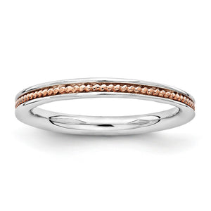Make it simple and stylish with stackable bands of different textures, finishes, widths and colors! This rhodium plated sterling silver band features a rose gold tone channeled center with a polished finish that measures 2.5mm wide. Guaranteed to fit together perfectly with all of the mix and match Stackable Expressions rings.