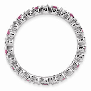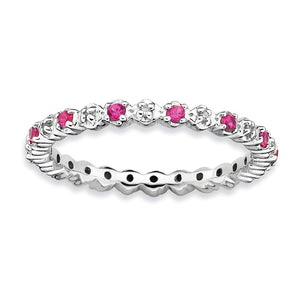 • Created Ruby, July's birthstone is known as the stone of spiritual wisdom, health, and knowledge; bringing contentment and peace. Diamonds of course are said to be a girl's best friend. This 2.5mm wide band fashioned from rhodium plated sterling silver is prong set with alternating gemstones all the way around. Created rubies like their natural counterparts can range from pink to deep red so please allow for variations in color. The natural diamonds are 0. Mm in size, H-I in color, I3 in clarity and the total diamond weight is .4 carat. Guaranteed to fit together perfectly with all of the mix and match Stackable Expressions rings.