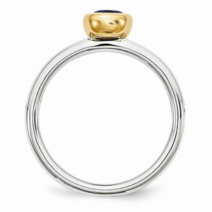 Featured atop a 2.5mm tarnish resistant rhodium-plated sterling silver band is a 5mm 0.-carat round created sapphire bezel set in a yellow gold-tone plated low profile mounting. Created sapphires like their natural counterparts can range from deepest midnight to brilliant cornflower blue so please allow for variations in color. Guaranteed to fit together perfectly with all of the mix and match Stackable Expressions rings.