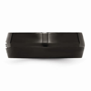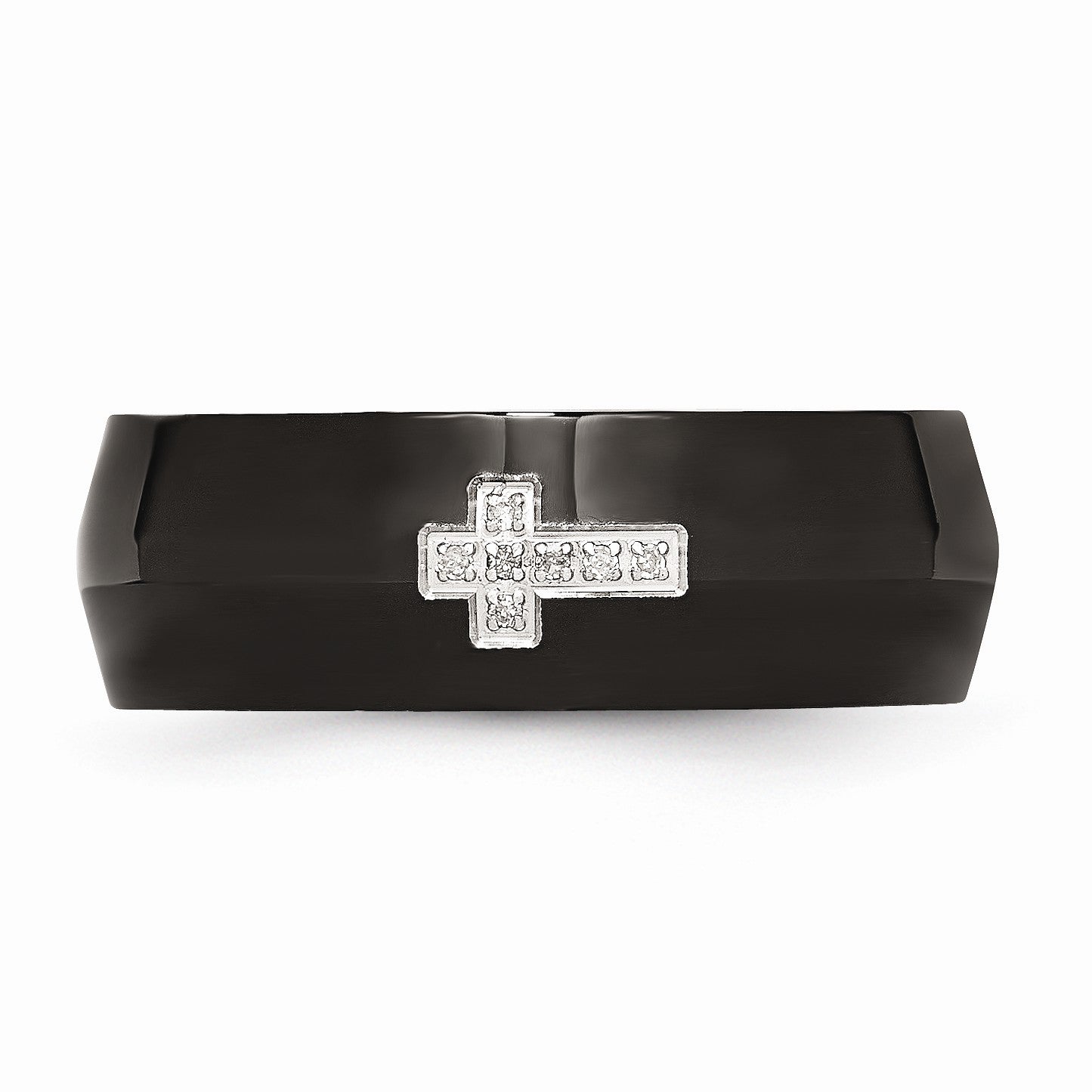 This polished 8mm stainless steel band features a black-plated surface that is created with an advanced process that fuses color to the metal to ensure hardness and lasting durability. A single recessed cross is prong set with 7 round H-I white diamonds totaling .2 of a carat.
