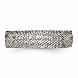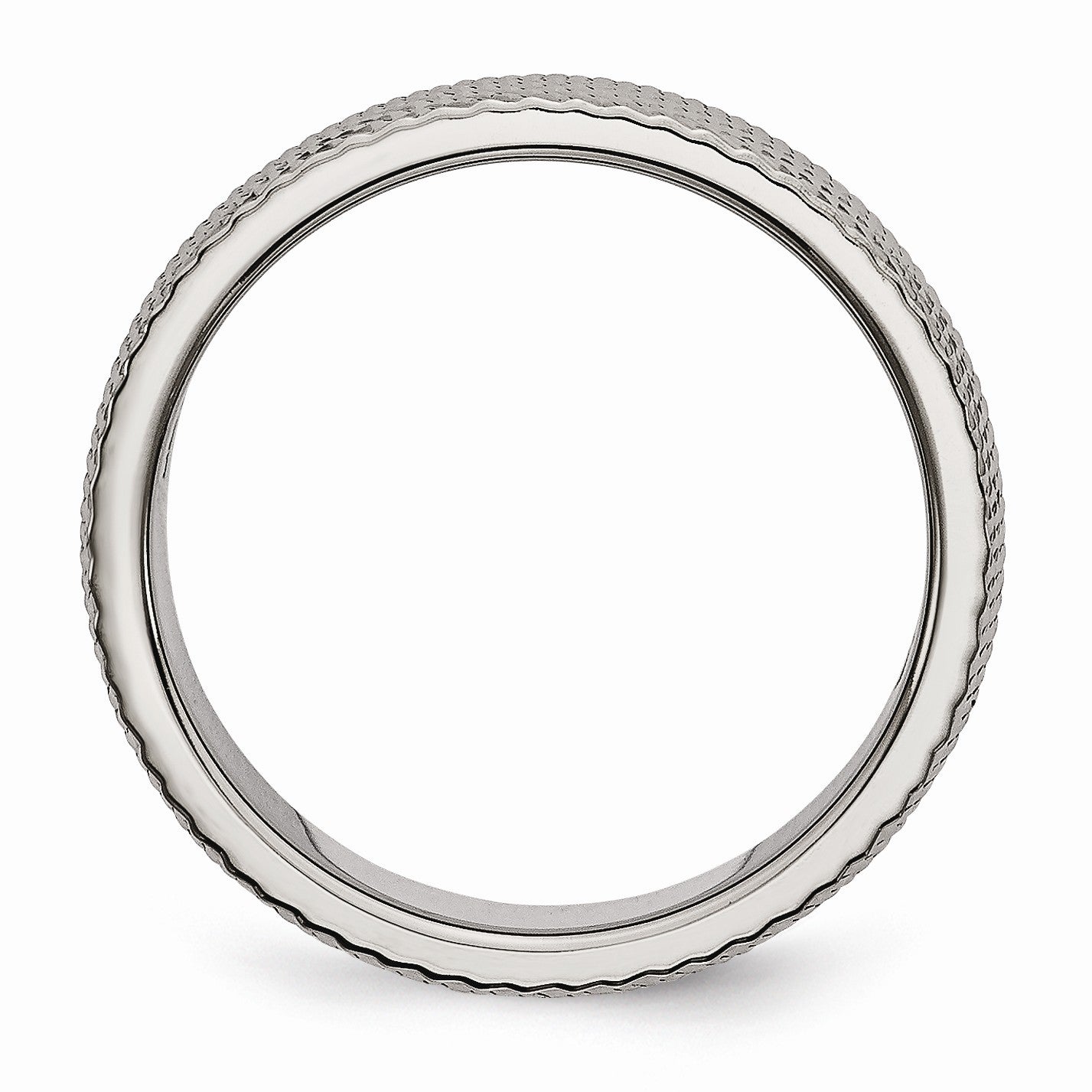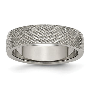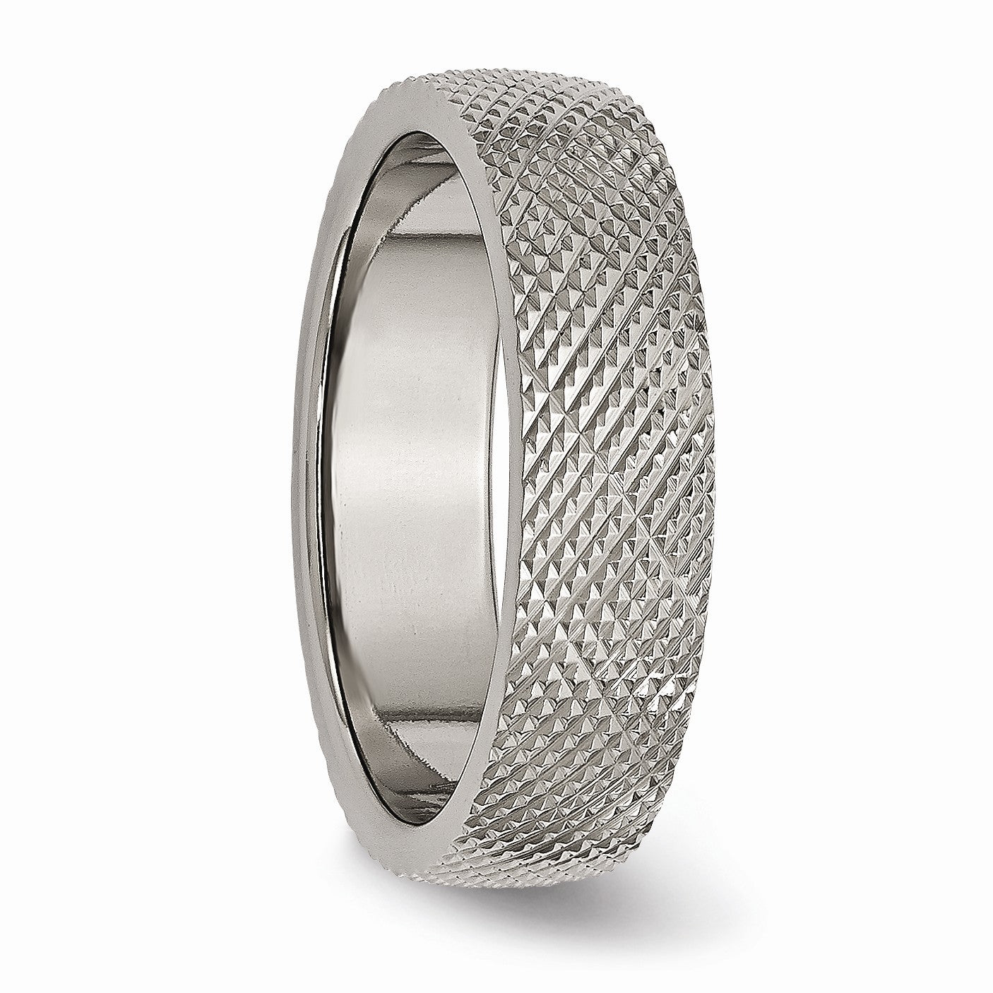 This stylish, titanium ring wins rave reviews from both men and women for its standard fit and textured flat design. It features a high polished finish and is approximately 6mm in width. Suitable for engraving.