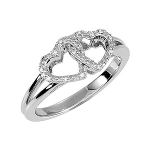 It starts with a smile and then blossoms into something special. Help create a love story with this interlocking double heart ring fashioned from sterling silver. The 8mm by 14mm open hearts are prong set with 14 various sized, round white diamonds totaling 1/20 of a carat. The natural diamonds are H-I in color, I2 in clarity. This is a made to order item and is estimated to ship in about 12 days. Please email service@theblackbow.com for more details.