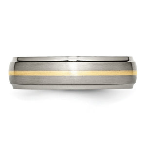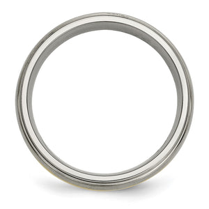 Distinctive style featuring a domed shape, a 14k yellow gold inlay center with a brushed finish, ridged edges with a polished finish, and a standard fit shank created from titanium. This 6mm width, two-tone, unisex band is suitable for engraving.�
