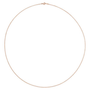 Solid oval links of 14k rose gold interlock with alternating links turned 90-degrees to create a classic cable chain design that never goes out of style. This children's necklace chain measures 1mm in width by 15-inches in length and fastens with a spring ring clasp.