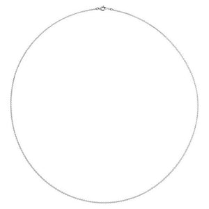 • Solid oval links of rhodium plated 14k white gold interlock with alternating links turned 90-degrees to create a classic cable chain design that never goes out of style. This children's necklace chain measures 1mm in width by 15-inches in length and fastens with a spring ring clasp.