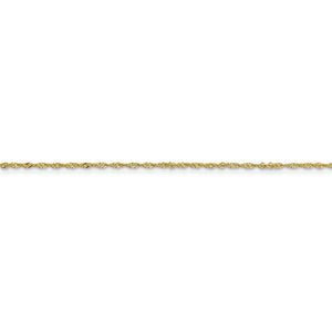 Known for its unique twisted design this 1.1mm Singapore chain features a solid construction with a radiant, polished finish that catches the light with every movement. It is fashioned from 10k yellow gold with an easy to use spring-ring clasp. 9 inches in length.