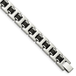 11mm Brushed Stainless Steel & Black Rubber Link Bracelet, 8.5 Inch