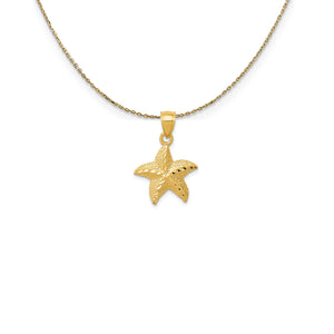 A sculpted starfish pays homage to beachcombing treasures. This 2-dimensional polished sea star created from solid 14k gold features a true to life, textured design with diamond-cut accents that measures approximately 15mm (9/16 inch) in width by 22mm (7/8 Inch) in length including the tapered bail. Includes a 20 inch long, 0.9mm wide, solid 14k yellow gold cable chain with a spring ring clasp.