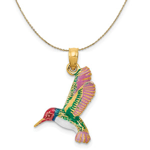 Hummingbirds remind us to savor each fleeting moment and to move forward with a powerful sense of wonder and presence. This three-dimensional pendant fashioned from 14k yellow gold features a colorful enamel design that is approximately 13mm (1/2 Inch) in width by 21mm (13/16 inch) in length, which includes the tapered bail. Includes a 18 inch long, 0.9mm wide, solid 14k yellow gold cable chain with a spring ring clasp.