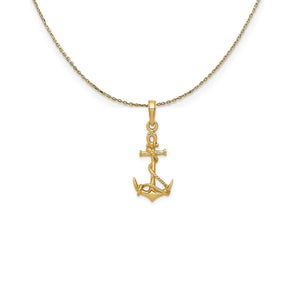 • A classic nautical symbol, an anchor with a shackle link and entwined rope created from polished 14k yellow gold. It features a solid, 3-dimensional design and measures approximately 11mm (7/16 Inch) wide by 25mm (1 Inch) long, which includes the tapered bail. Includes a 18 inch long, 0.9mm wide, solid 14k yellow gold cable chain with a spring ring clasp.