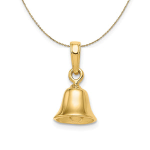 • This bell pendant is crafted with polished 14 karat yellow gold and it features a moveable, three dimensional design. The approximate size is 10 mm x 16 mm and its average item weight is 1.44 grams. Includes a 24 inch long, 0.9mm wide, solid 14k yellow gold cable chain with a spring ring clasp.