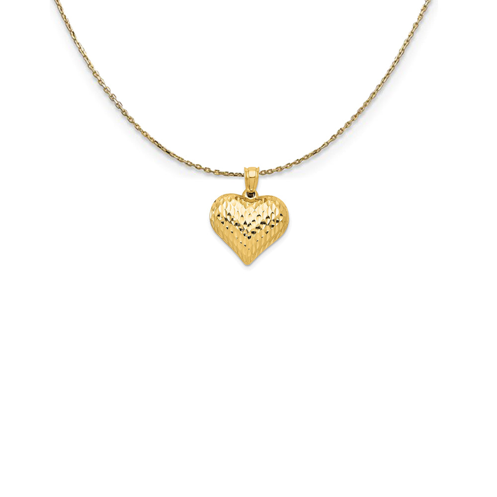 This classic puffed diamond cut heart charm fashioned from 14k yellow gold is finished with a standard jump ring that easily slips onto a necklace chain or charm bangle of your choice. This heart measures approximately 16mm and features a hollow 3-D design. Includes a 20 inch long, 0.9mm wide, solid 14k yellow gold cable chain with a spring ring clasp.