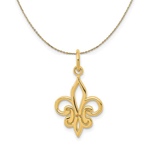 Tie the meaning to the moment with a classic or unusual pendant that makes it personal, thoughtful, or meaningful. This fleur-de-lis charm crafted in 14k yellow gold features a polished flat design. The approximate size is 13mm (1/2 inch) in width by 22mm (7/8 inch) in length with the bail. Includes a 18 inch long, 0.9mm wide, solid 14k yellow gold cable chain with a spring ring clasp.