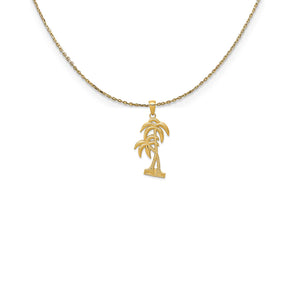 Escape to the tropics with this double palm tree pendant crafted from 14k yellow gold featuring a 2-dimensional, textured and polished design. It measures approximately 16mm (5/8 Inch) wide by 33mm (1 1/4 Inch) long, which includes the tapered bail. Includes a 18 inch long, 0.9mm wide, solid 14k yellow gold cable chain with a spring ring clasp.