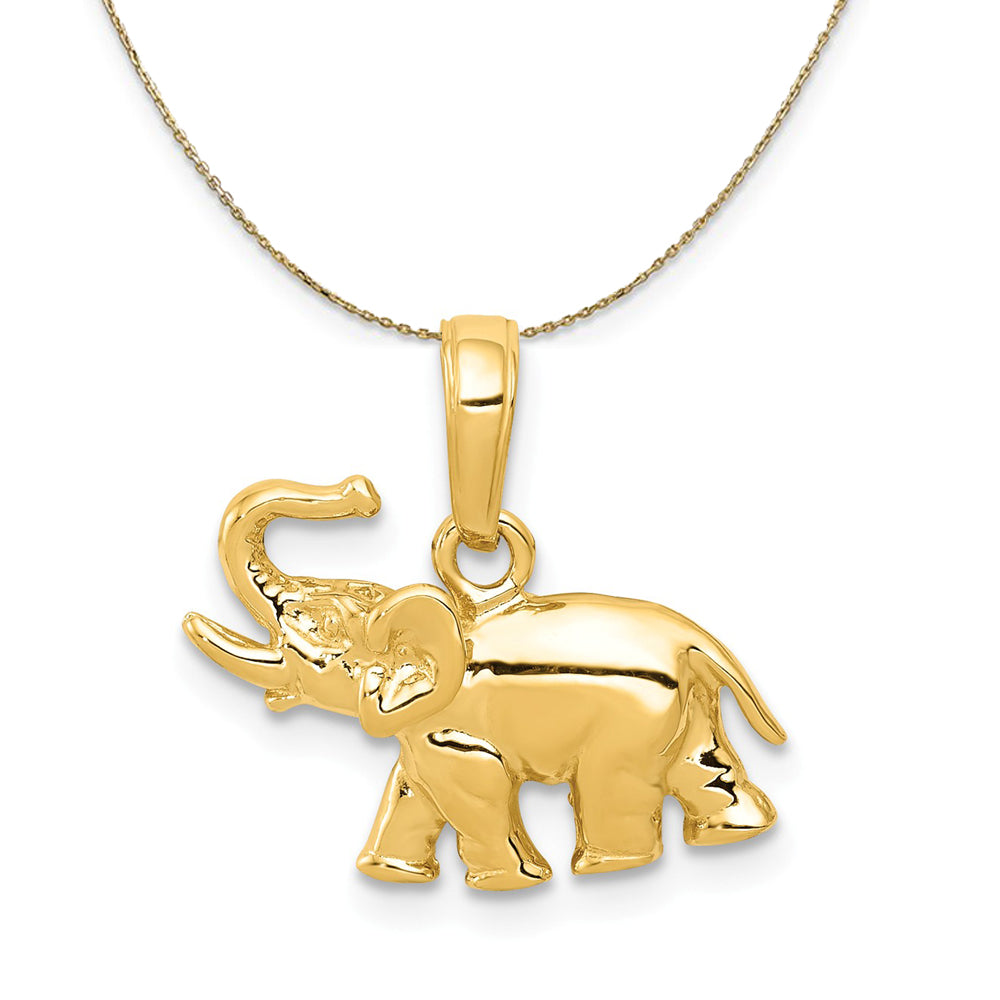 • As a symbolic symbol, meaningful totem, or just because you love elephants this 14k yellow gold pendant is a winner. It features a two-dimensional open back design with a high polished finish that is approximately 17mm (5/8 Inch) in width by 15mm (9/16 inch) in length, which includes the tapered bail. The pendant is . Includes a 22 inch, 0.8mm 14k yellow gold cable chain with a lobster clasp.