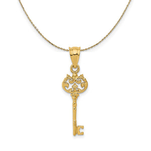 This fancy key pendant is crafted with 14 karat yellow gold and it features a polished finish. The approximate size is 8 mm x 27 mm and its average item weight is 1.12 grams. Includes a 24 inch long, 0.9mm wide, solid 14k yellow gold cable chain with a spring ring clasp.