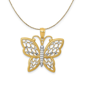 Symbolic of change, elegance, growth, transformation, and more, the butterfly is a treasure trove of good omens. This gleaming pendant fashioned from 14k yellow gold and white rhodium plating is approximately 23mm (15/16 Inch) in width by 23mm (15/16 Inch) in length, which includes the tapered bail. Includes a 20 inch long, 0.9mm wide, solid 14k yellow gold cable chain with a spring ring clasp.