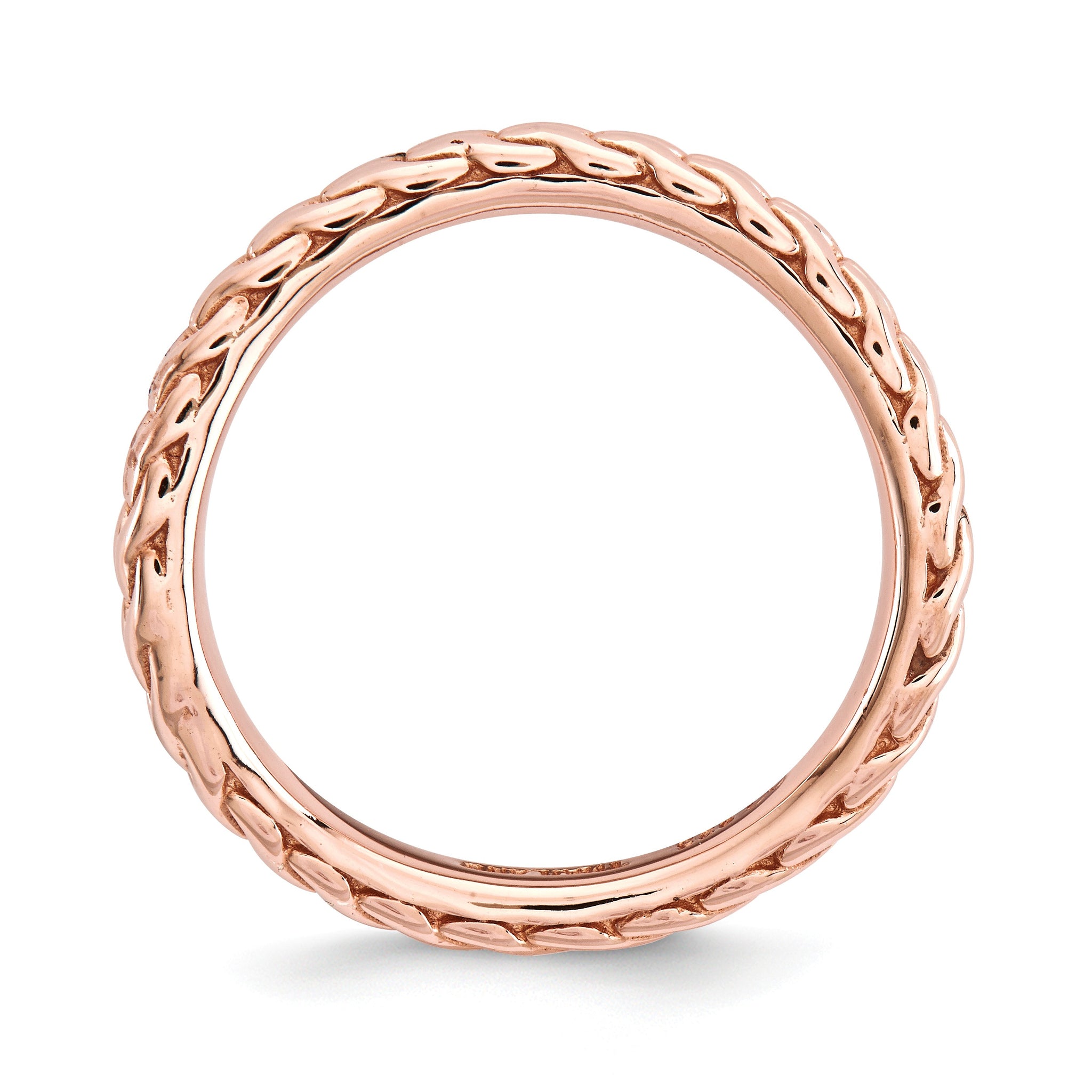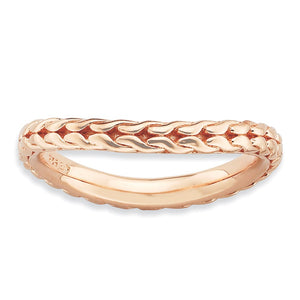 Contemporary geometric style! Create a unique stacked design with curved bands of different colors, patterns and widths. This 2.5mm band fashioned from sterling silver features a polished 14k rose gold plated finish, a gentle wave shape and a wheat pattern. Wear it alone or stack with other curved bands only.