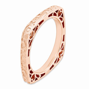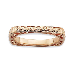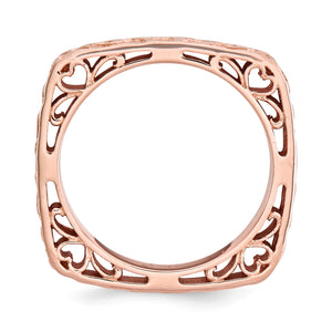 Contemporary geometric style! This 2.5mm square band fashioned from sterling silver features a polished 14k rose gold plated finish, a textured grooved design and open filigree sides. Guaranteed to fit together perfectly with all of the mix and match Stackable Expressions rings.