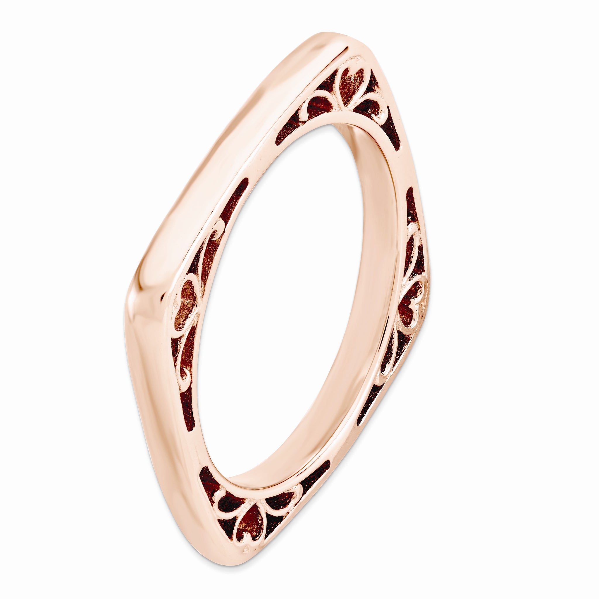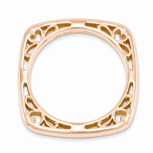 Contemporary geometric style! This 2.5mm square band fashioned from sterling silver features a polished 14k rose gold plated finish, smooth edges with soft rounded corners and open filigree sides. Guaranteed to fit together perfectly with all of the mix and match Stackable Expressions rings.