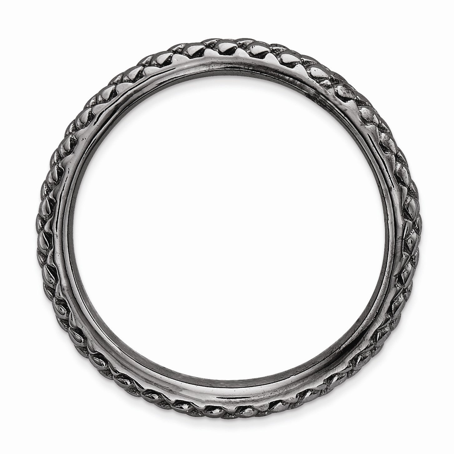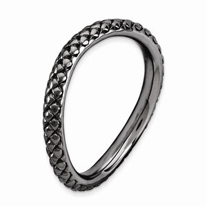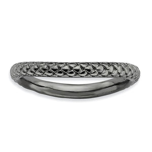 Contemporary geometric style! Create a unique stacked design with curved bands of different colors, patterns and widths. This 2.5mm band fashioned from sterling silver features a polished black ruthenium-plated finish, a gentle wave shape and a textured pattern. Wear it alone or stack with other curved bands only.