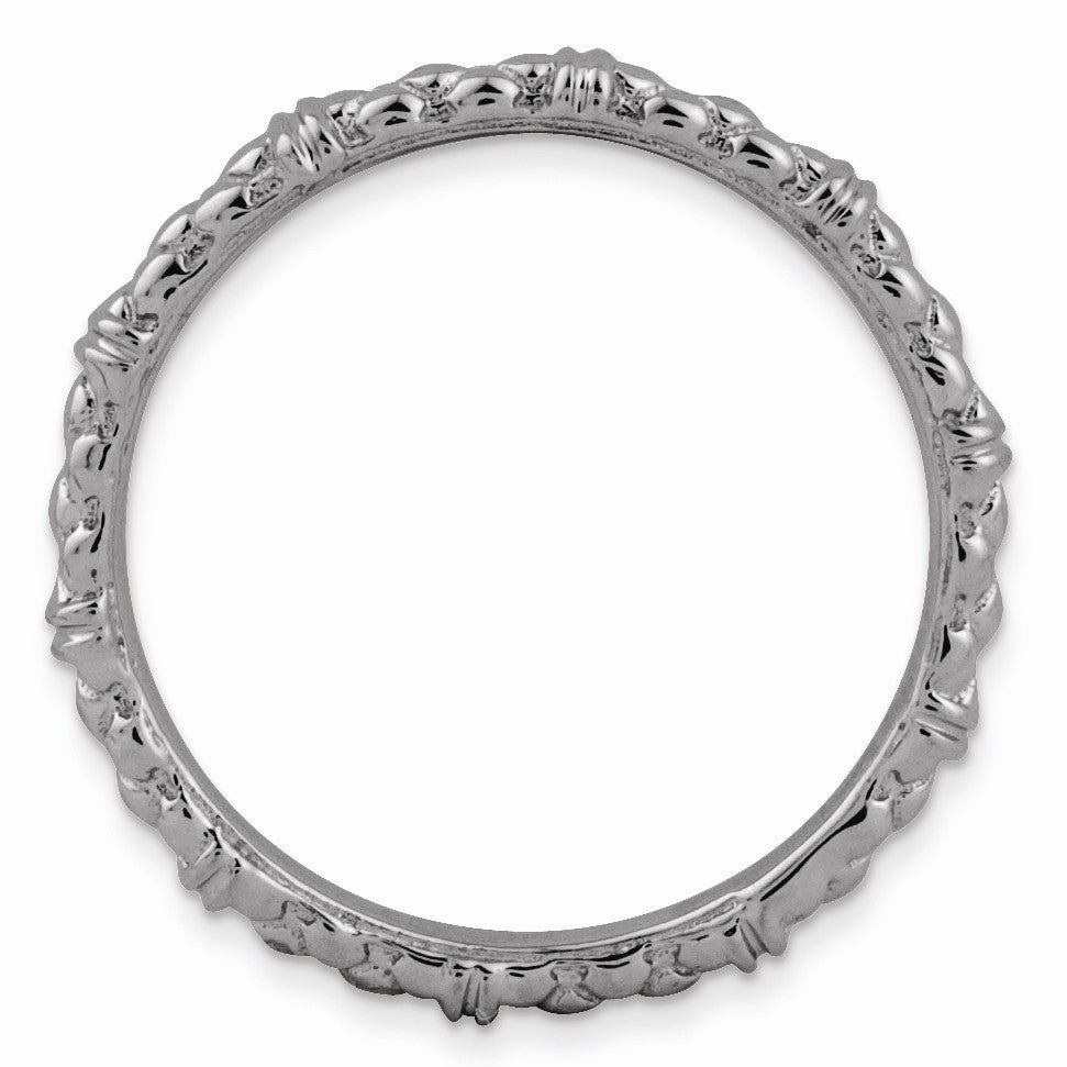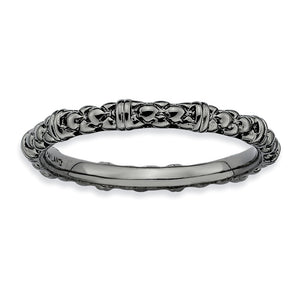 Make it simple and stylish with bands of different textures, finishes, widths and colors! This black ruthenium-plated sterling silver band features a patterned design with a high polished finish that measures 2.5mm wide. Guaranteed to fit together perfectly with all of the mix and match Stackable Expressions rings.