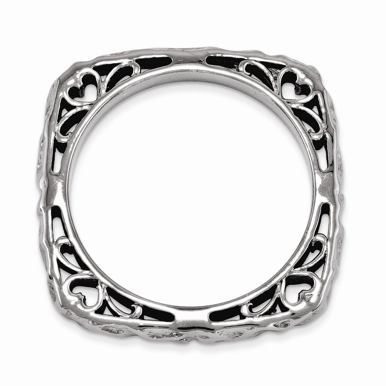 • Contemporary geometric style! This 2.5mm square band fashioned from sterling silver features a polished black ruthenium-plated finish, hammered edges and open filigree sides. Guaranteed to fit together perfectly with all of the mix and match Stackable Expressions rings.