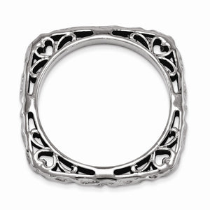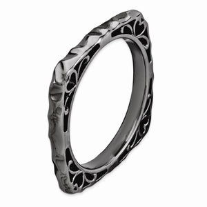 Contemporary geometric style! This 2.5mm square band fashioned from sterling silver features a polished black ruthenium-plated finish, hammered edges and open filigree sides. Guaranteed to fit together perfectly with all of the mix and match Stackable Expressions rings.