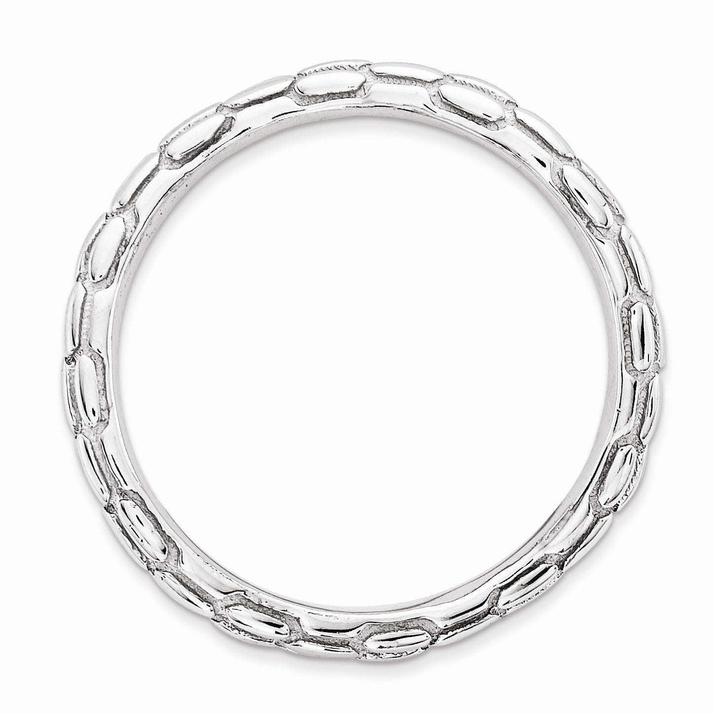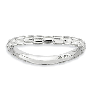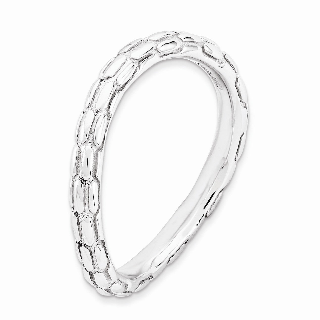Contemporary geometric style! Create a unique stacked design with curved bands of different colors, patterns and widths. This 2.5mm band fashioned from sterling silver features a polished rhodium plated finish, a gentle wave shape and a rice pattern. Wear it alone or stack with other curved bands only.