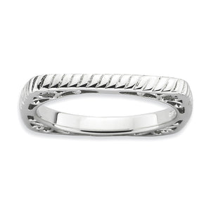 • Contemporary geometric style! This 2.5mm square band fashioned from sterling silver features a polished rhodium plated finish, grooved edges and open filigree sides. Guaranteed to fit together perfectly with all of the mix and match Stackable Expressions rings.