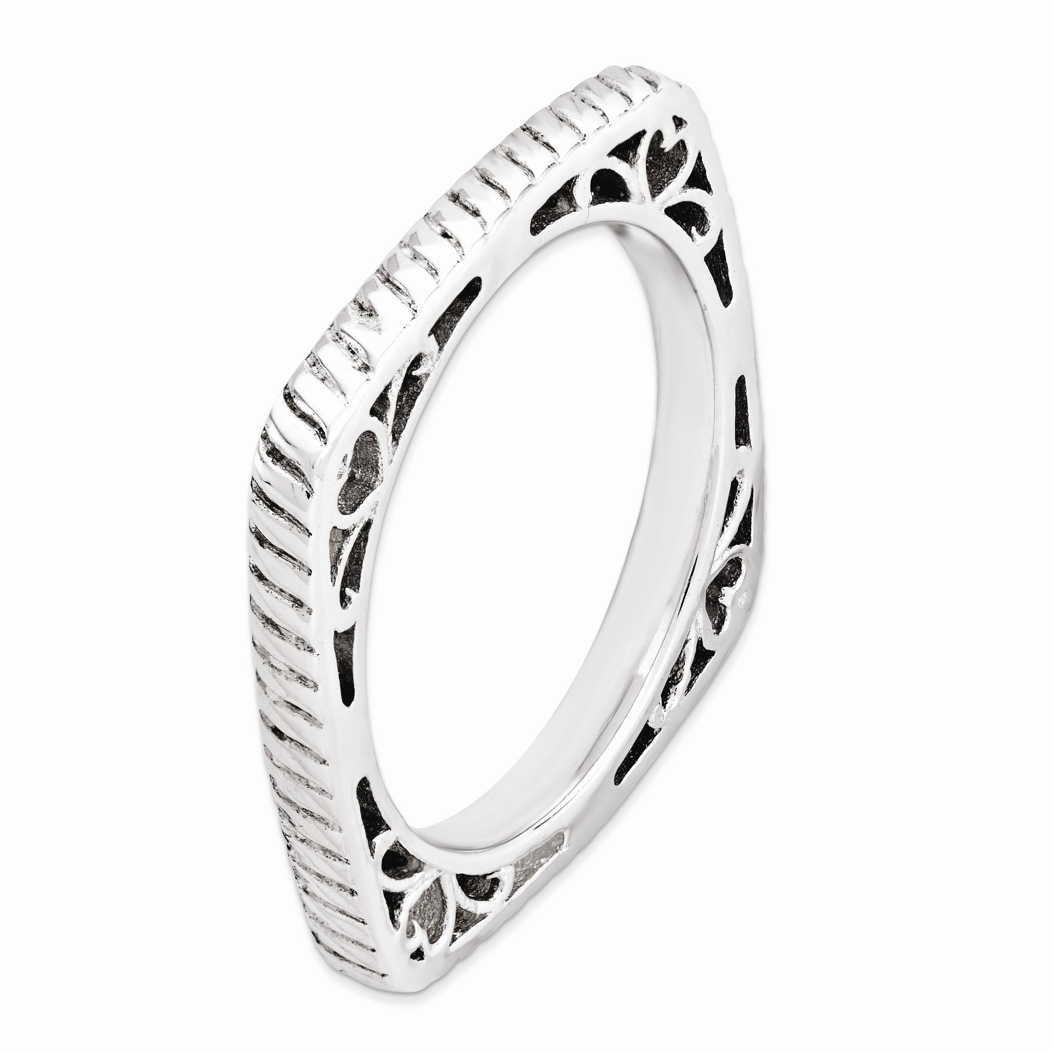 Contemporary geometric style! This 2.5mm square band fashioned from sterling silver features a polished rhodium plated finish, grooved edges and open filigree sides. Guaranteed to fit together perfectly with all of the mix and match Stackable Expressions rings.