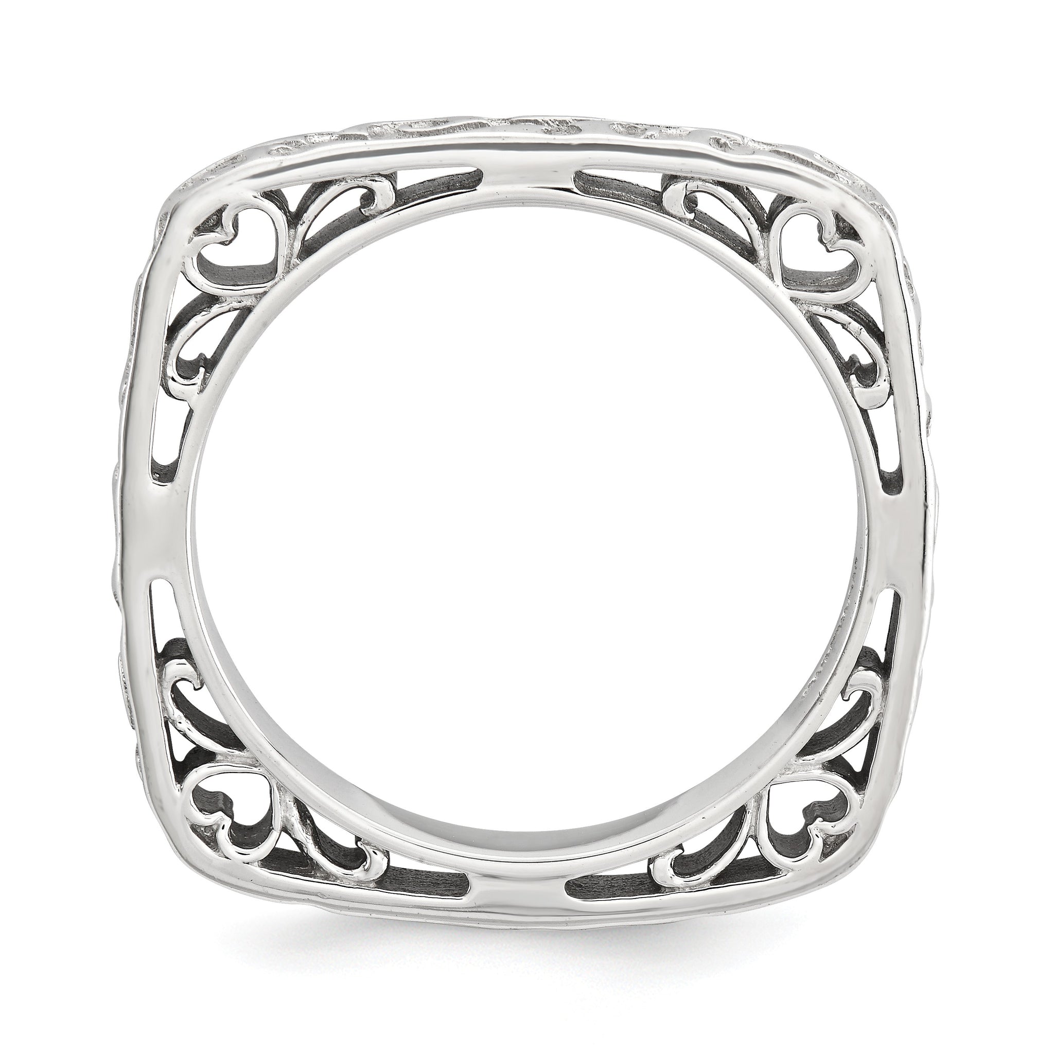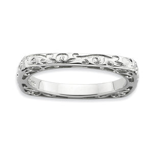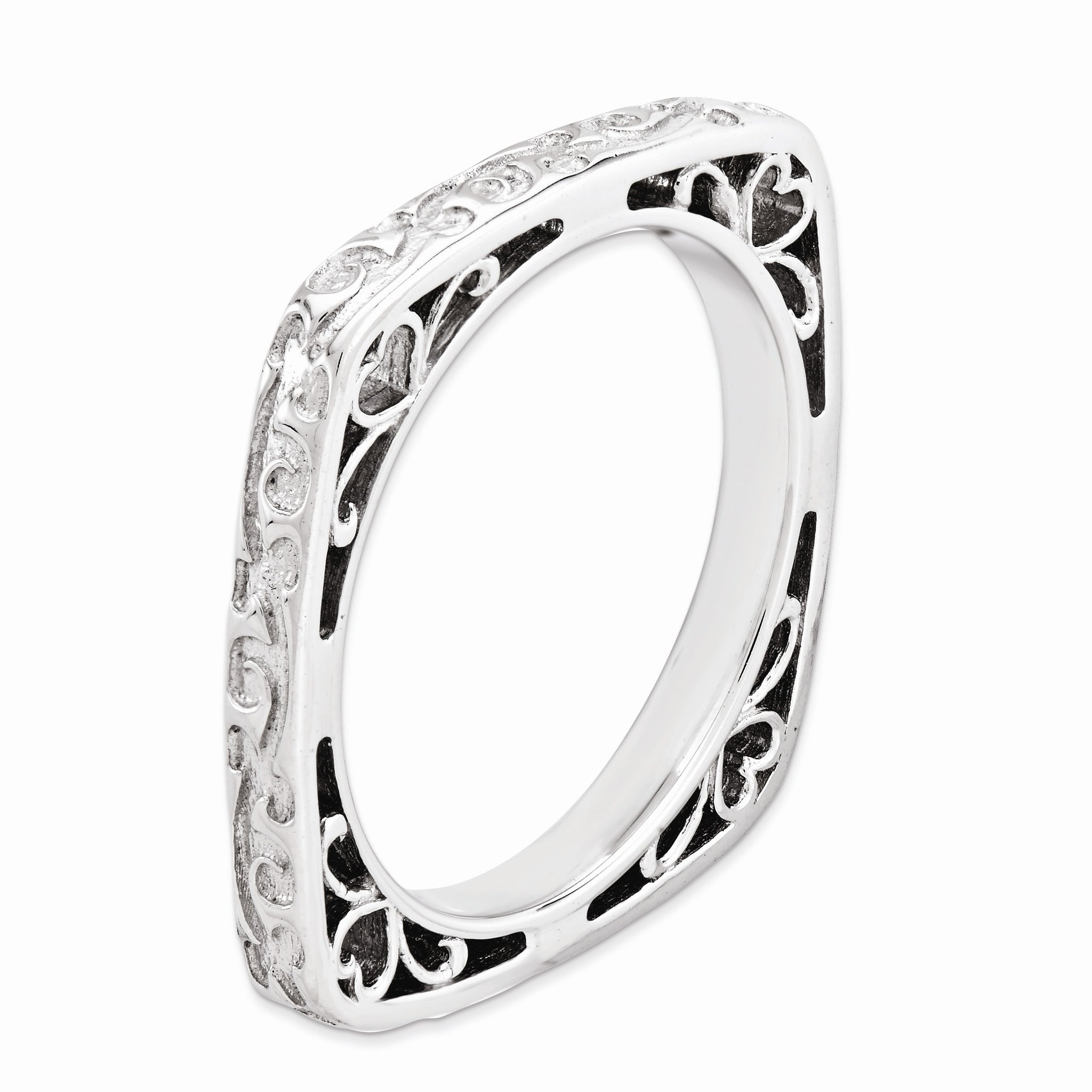 Contemporary geometric style! This 2.5mm square band fashioned from sterling silver features a polished rhodium plated finish, a textured grooved design and open filigree sides. Guaranteed to fit together perfectly with all of the mix and match Stackable Expressions rings.