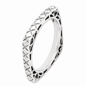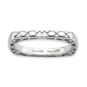 • Contemporary geometric style! This 2.5mm square band fashioned from sterling silver features a polished rhodium plated finish, a crisscrossed pattern and open filigree sides. Guaranteed to fit together perfectly with all of the mix and match Stackable Expressions rings.