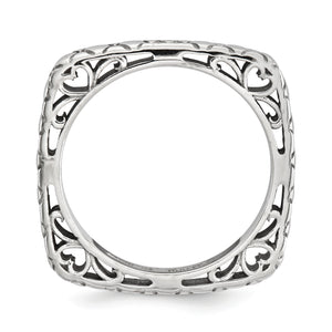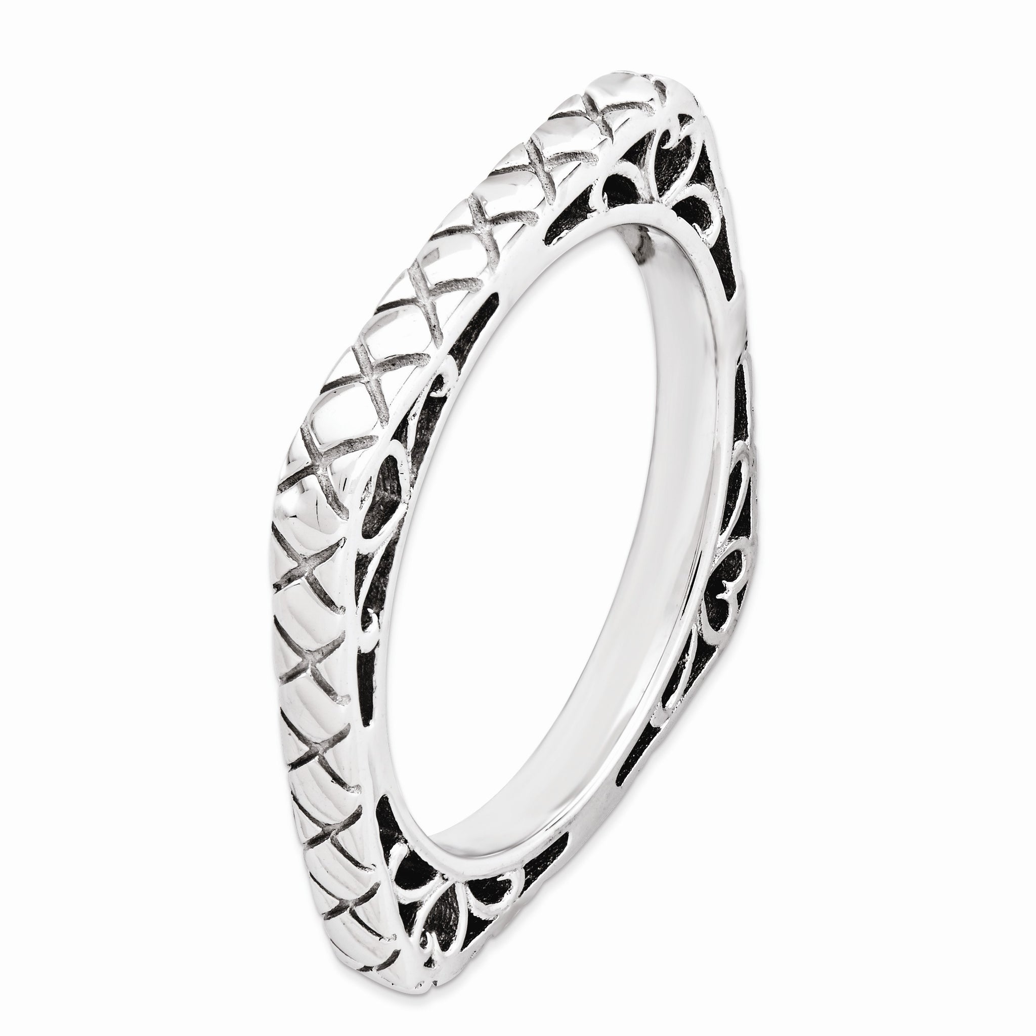 Contemporary geometric style! This 2.5mm square band fashioned from sterling silver features a polished rhodium plated finish, a crisscrossed pattern and open filigree sides. Guaranteed to fit together perfectly with all of the mix and match Stackable Expressions rings.
