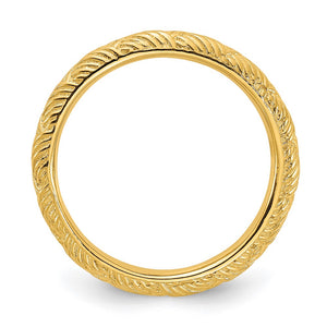 • Make it simple and stylish with bands of different textures, finishes, widths and colors! This stackable ring created from 14k yellow gold-plated sterling sliver features a polished basket weave pattern. The approximate band width is 2.5mm. Guaranteed to fit together perfectly with all of the mix and match Stackable Expressions rings.
