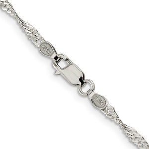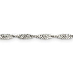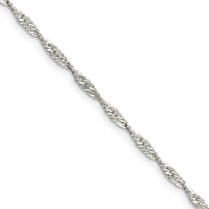 A series of interwoven loops on this elegant Singapore chain catches the light from every angle thanks to the twisted link design. It measures 2.25mm in width by 8-inches in length and is fashioned from polished sterling silver with a classic lobster claw clasp.