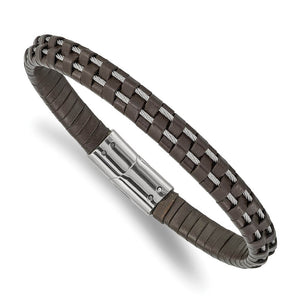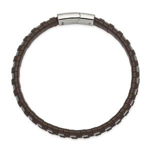 Rugged masculine style created from polished stainless steel and genuine brown leather. This 8.75 inch bracelet is approximately 7.5mm (5/16 inch) in width and closes with a magnetic clasp.