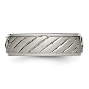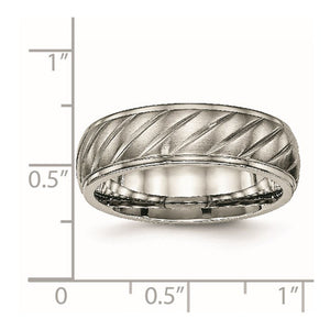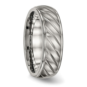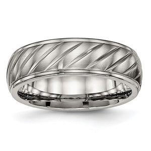 Distinctive style featuring a brushed domed center with a diagonal grooved pattern, polished ridged edges and a standard fit interior designed from titanium. This 7mm width band is suitable for engraving.�