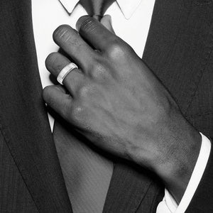 Edged with an elegant ridge detail this 7mm width flat band designed from titanium also features a standard fit or flat inner surface and a high polished finish. Available in whole and half sizes 6 to 14. Suitable for engraving.