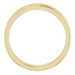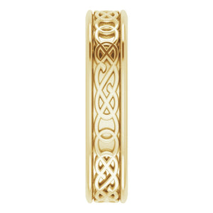 The Celtic inspired inlay design on this polished band is a historic symbol of love and represents an unbreakable bond. It is created from 14k yellow gold and features a standard fit or flat surface against the finger. The width is approximately 7mm and is 1.7mm in thickness. Suitable for engraving.